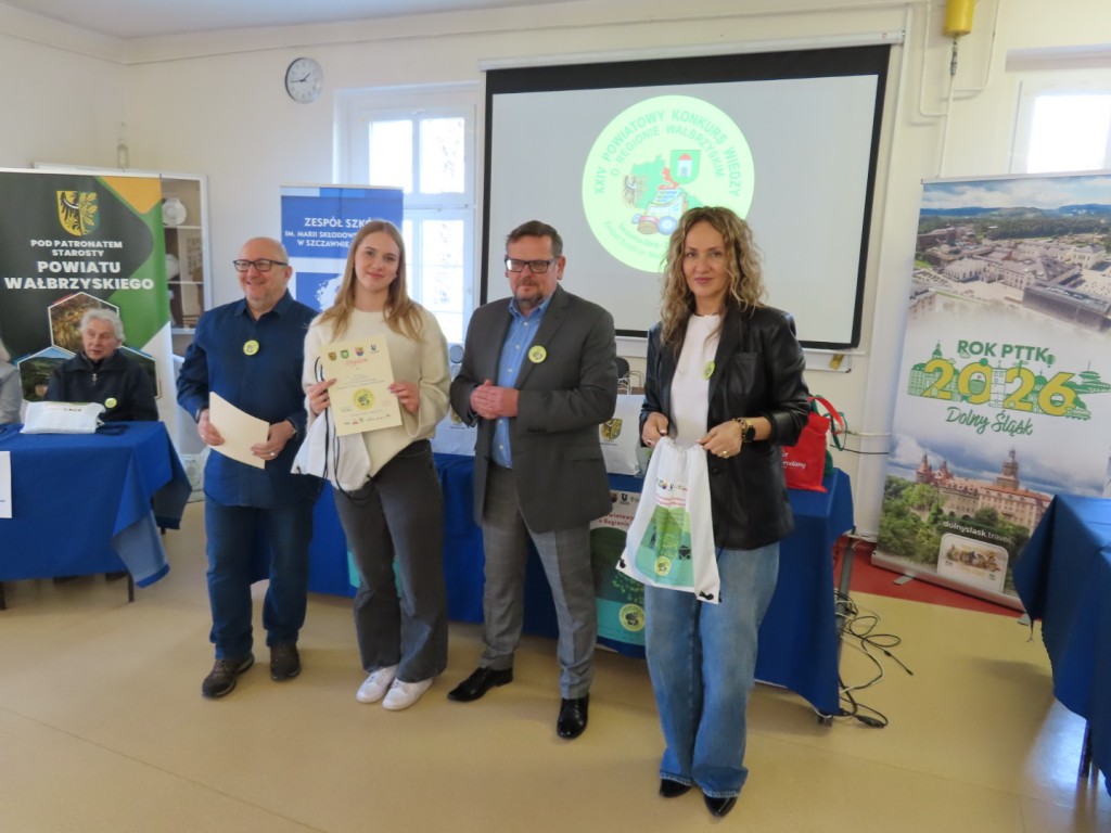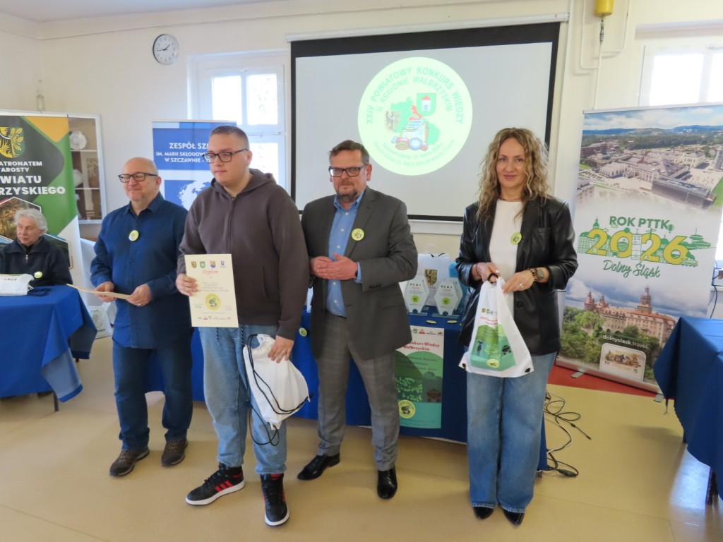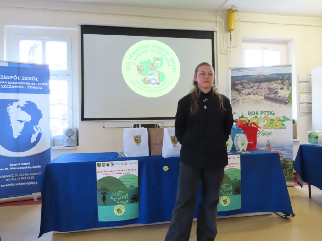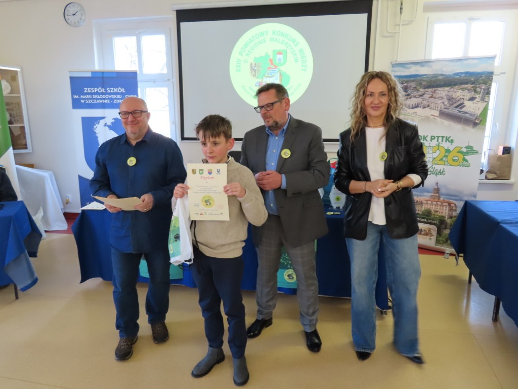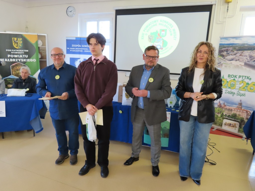 31 uczniów z ośmiu szkół podstawowych uczesniczyło w XXIV edycji Powiatowego Konkursu Wiedzy o Regionie Wałbrzyskim organizowanym przez Zespół Szkół im. Marii Skłodowskiej - Curie w Szczawnie Zdroju. Wśród uczestników byli członkowie Szkolne Koło Krajoznawczo-Turystyczne PTTK-PTSM "Wędrowniczek" oraz SKKT PTTK - PTSM "Włóczy-dzik" przy Zespole Szkolno- Przedszkolnym w Boguszowie- Gorcach. Koordynatorem całego przedsięwzięcia jest od samego początku sekretarz naszego oddziału pan Artur Ciempa. Mamy zaszczyt być współorganizatorem konkursu i sponsorem nagród. Pan Prezes Zygmunt Nowaczyk miał okazję, jak zwykle być jednym z zaproszonych gości, i zabrać głos, chwaląc gospodarzy imprezy oraz młodzież i opiekunów za tak dobrą organizację, frekwencję i zaangażowanie.