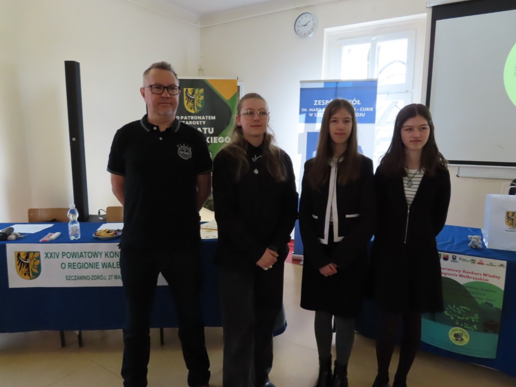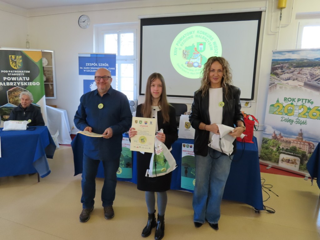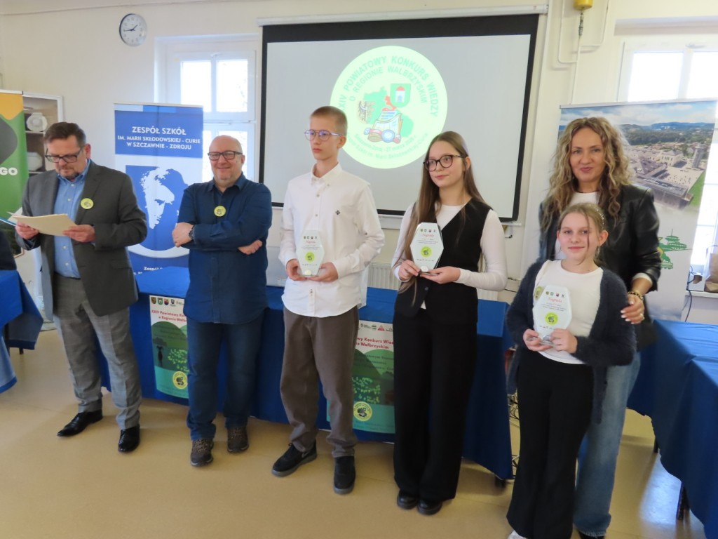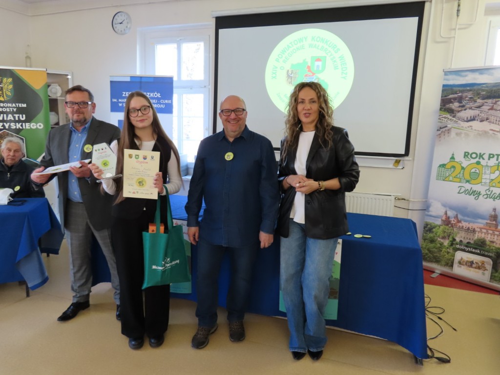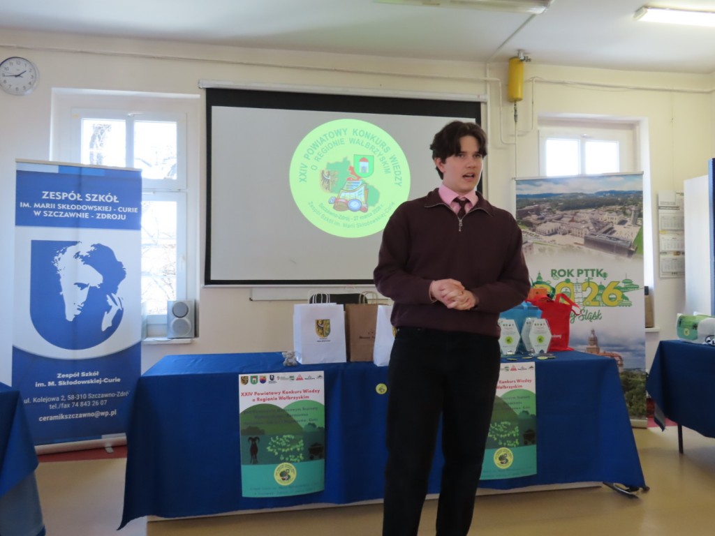 31 uczniów z ośmiu szkół podstawowych uczesniczyło w XXIV edycji Powiatowego Konkursu Wiedzy o Regionie Wałbrzyskim organizowanym przez Zespół Szkół im. Marii Skłodowskiej - Curie w Szczawnie Zdroju. Wśród uczestników byli członkowie Szkolne Koło Krajoznawczo-Turystyczne PTTK-PTSM "Wędrowniczek" oraz SKKT PTTK - PTSM "Włóczy-dzik" przy Zespole Szkolno- Przedszkolnym w Boguszowie- Gorcach. Koordynatorem całego przedsięwzięcia jest od samego początku sekretarz naszego oddziału pan Artur Ciempa. Mamy zaszczyt być współorganizatorem konkursu i sponsorem nagród. Pan Prezes Zygmunt Nowaczyk miał okazję, jak zwykle być jednym z zaproszonych gości, i zabrać głos, chwaląc gospodarzy imprezy oraz młodzież i opiekunów za tak dobrą organizację, frekwencję i zaangażowanie.