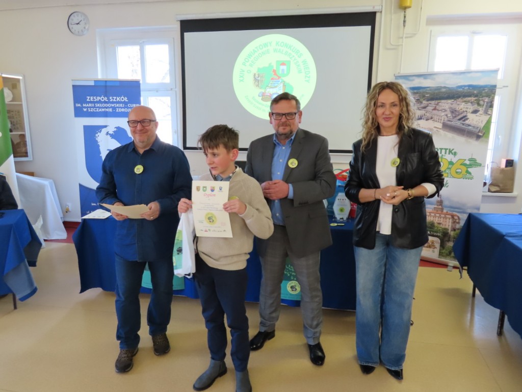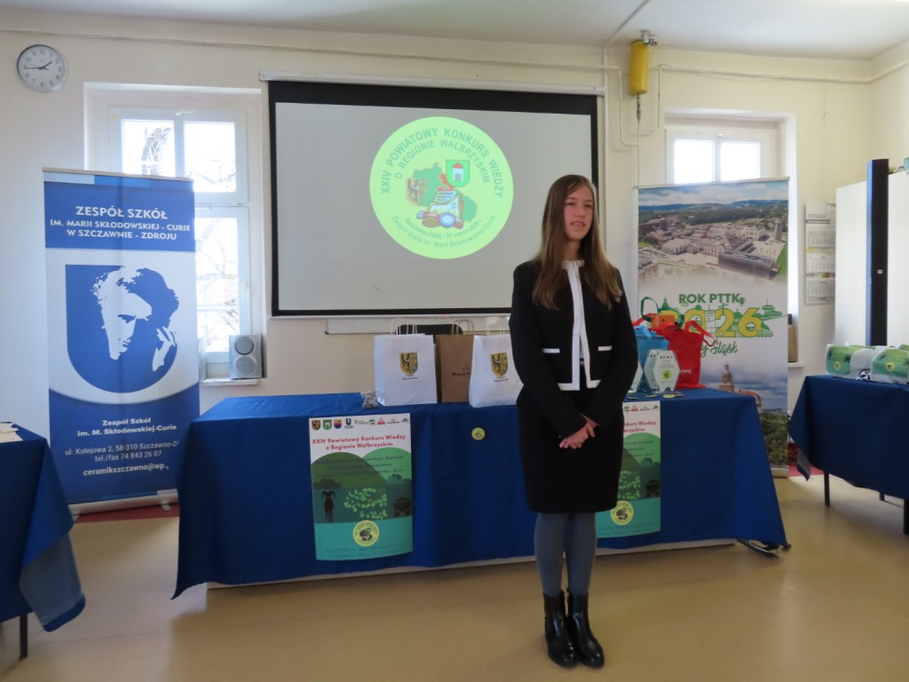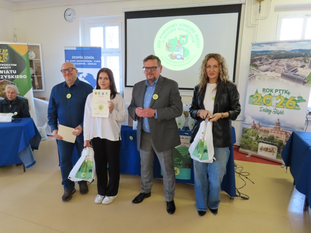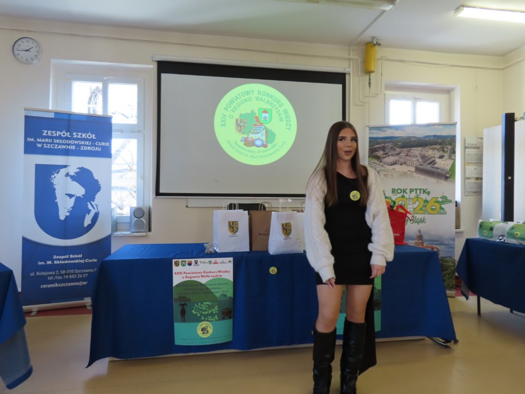 31 uczniów z ośmiu szkół podstawowych uczesniczyło w XXIV edycji Powiatowego Konkursu Wiedzy o Regionie Wałbrzyskim organizowanym przez Zespół Szkół im. Marii Skłodowskiej - Curie w Szczawnie Zdroju. Wśród uczestników byli członkowie Szkolne Koło Krajoznawczo-Turystyczne PTTK-PTSM "Wędrowniczek" oraz SKKT PTTK - PTSM "Włóczy-dzik" przy Zespole Szkolno- Przedszkolnym w Boguszowie- Gorcach. Koordynatorem całego przedsięwzięcia jest od samego początku sekretarz naszego oddziału pan Artur Ciempa. Mamy zaszczyt być współorganizatorem konkursu i sponsorem nagród. Pan Prezes Zygmunt Nowaczyk miał okazję, jak zwykle być jednym z zaproszonych gości, i zabrać głos, chwaląc gospodarzy imprezy oraz młodzież i opiekunów za tak dobrą organizację, frekwencję i zaangażowanie.