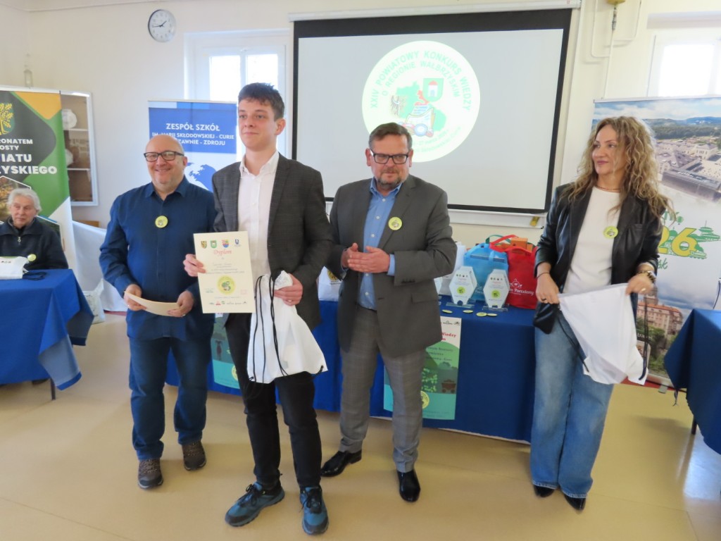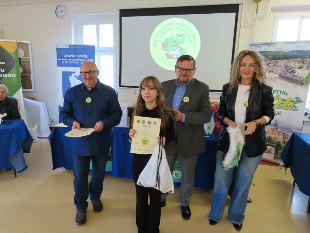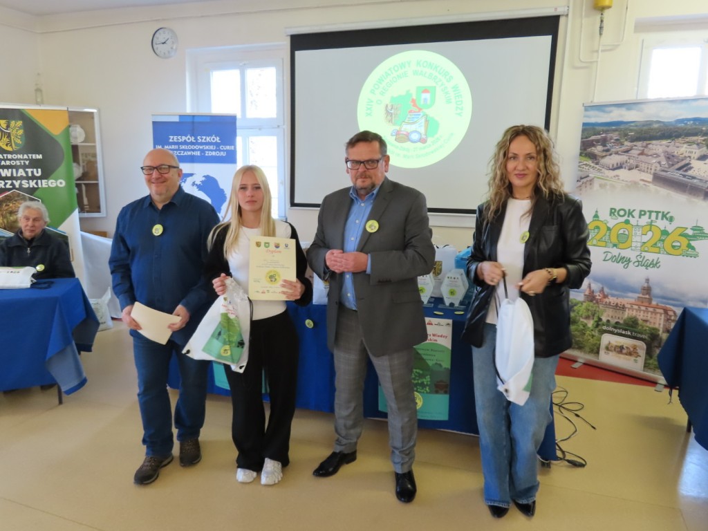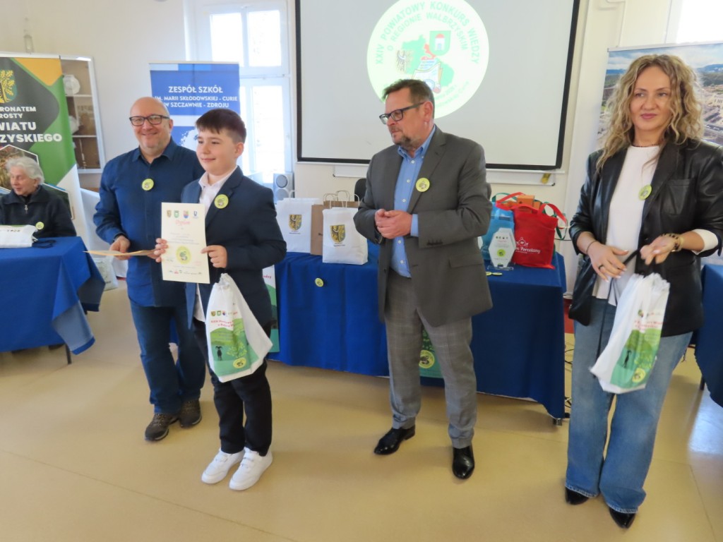 31 uczniów z ośmiu szkół podstawowych uczesniczyło w XXIV edycji Powiatowego Konkursu Wiedzy o Regionie Wałbrzyskim organizowanym przez Zespół Szkół im. Marii Skłodowskiej - Curie w Szczawnie Zdroju. Wśród uczestników byli członkowie Szkolne Koło Krajoznawczo-Turystyczne PTTK-PTSM "Wędrowniczek" oraz SKKT PTTK - PTSM "Włóczy-dzik" przy Zespole Szkolno- Przedszkolnym w Boguszowie- Gorcach. Koordynatorem całego przedsięwzięcia jest od samego początku sekretarz naszego oddziału pan Artur Ciempa. Mamy zaszczyt być współorganizatorem konkursu i sponsorem nagród. Pan Prezes Zygmunt Nowaczyk miał okazję, jak zwykle być jednym z zaproszonych gości, i zabrać głos, chwaląc gospodarzy imprezy oraz młodzież i opiekunów za tak dobrą organizację, frekwencję i zaangażowanie.